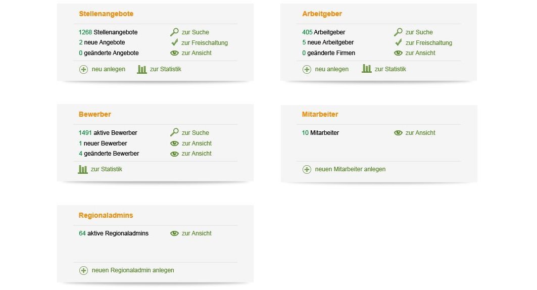 Zum einen wurde eine komfortable Verwaltungsoberfläche geschaffen, mit der die Mitarbeiter der AOK Arbeitgeber, Stellen und Benutzerkonten pflegen können. Hierfür wurde ein mehrstufiges Rollen- und Rechtekonzept ausgearbeitet, welches für die einzelnen Landes-AOKs an die jeweiligen Gegebenheiten angepasst werden kann. Diverse Freigabe- und Registrierungsprozesse sowie daran anhängige Mailbenachrichtigungen ermöglichen höchste Komfortabilität bei der Systempflege.