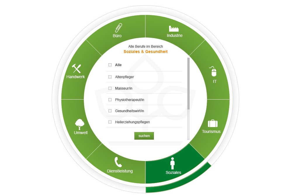 In Bezug auf Zielgruppenausrichtung und Usability entwickelte Schommer Media eine neue Such- und Darstellungsform. Verschiedene zielgruppengereichte Inhaltsbereiche mit individueller Ansprache informieren die junge Zielgruppe umfassend. Dabei werden die zahlreichen Berufe in leicht verständliche Berufsfelder untergliedert und in einer grafisch ansprechenden Weise dargestellt. Weiterhin wurden bereits Funktionen bereitgestellt, um das Portal zu einem späteren Zeitpunkt um die Felder duales Studium, Praktikum und FSJ zu erweitern.