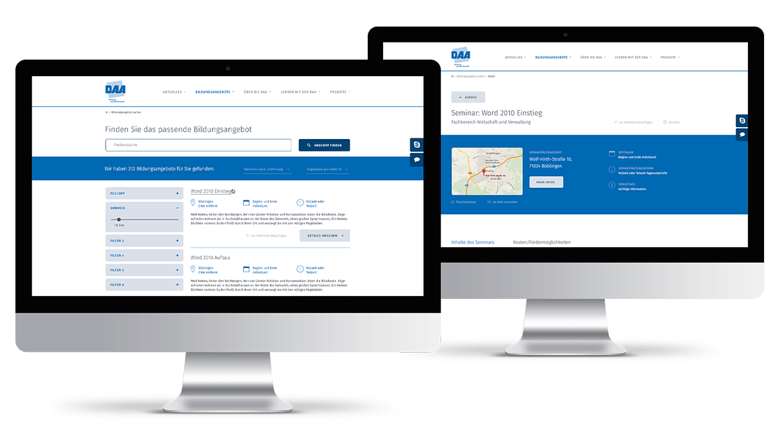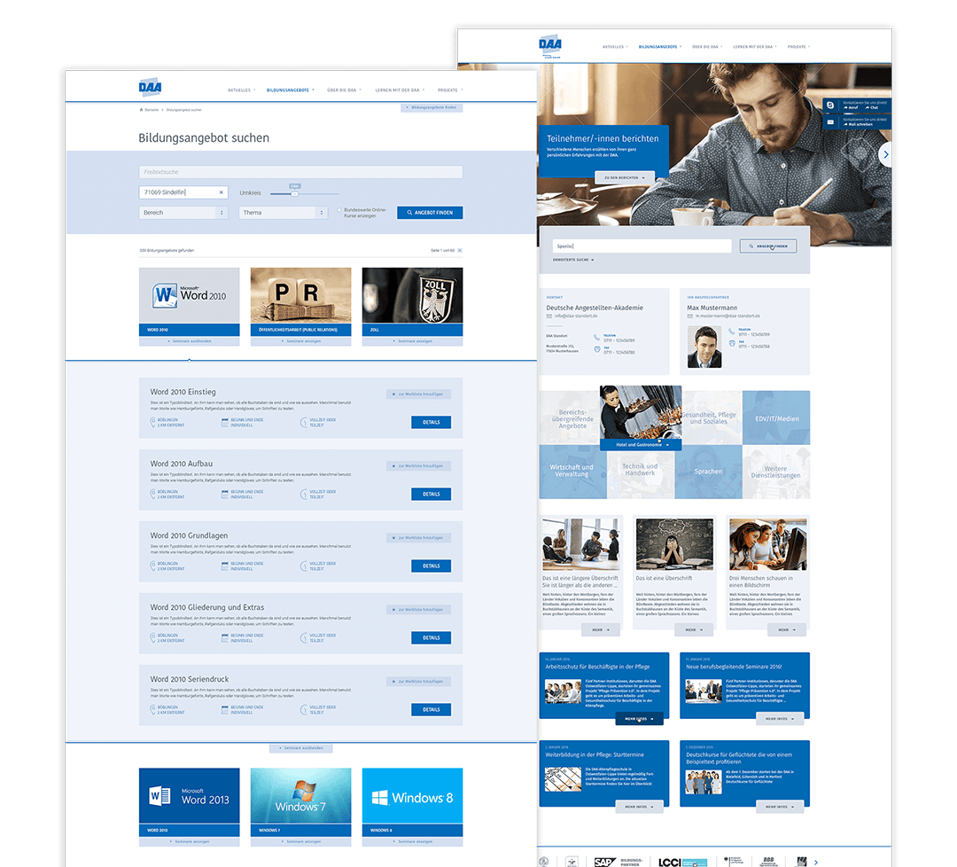 Für die Anbindung an die DAA-eigene Datenbank MSSV hat Schommer Media die passende Schnittstelle programmiert und konfiguriert. Hierbei war vor allem auf die Menge an Daten zu achten. Dies erforderte ein starkes Caching-Prinzip, um die Performance zu gewährleisten. Das Angebot aus über 60.000 Kursen wird nächtlich über die Schnittstelle automatisch eingelesen und aktualisiert. Die Kurse stehen dann auf den jeweiligen Standort-Webseiten optimiert nach Umkreis zur Verfügung.