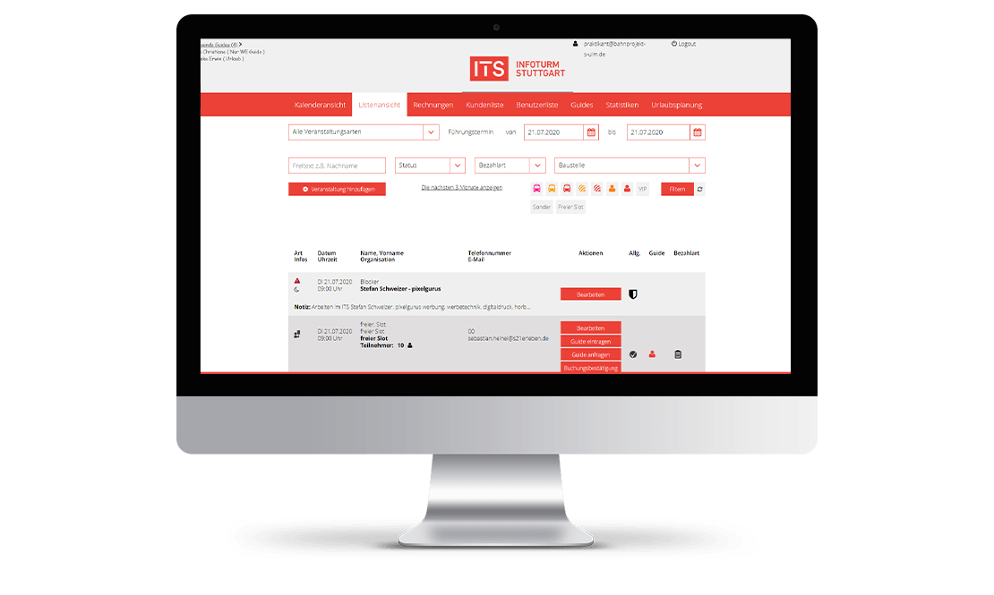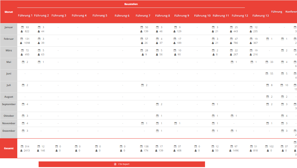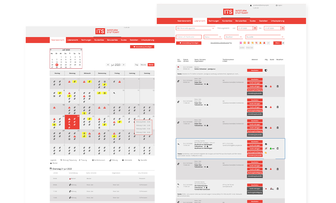 Mit den Jahren und mit zunehmender Bautätigkeit stieg die Anzahl der Führungen signifikant, was eine Software zur Abwicklung der Prozesse erforderlich machte. Hierzu entwickelte Schommer Media ein onlinebasiertes Buchungs- und Verwaltungssystem, welches über die Jahre weiterentwickelt und mit vielen Features und Funktionen erweitert wurde. Heute werden mit unserer Software fast 3.000 Führungen auf über 15 Baustellen des Bahnprojekts pro Jahr organisiert und verwaltet. Zudem werden darüber rund 250 Konferenzraumbuchungen abgewickelt.
