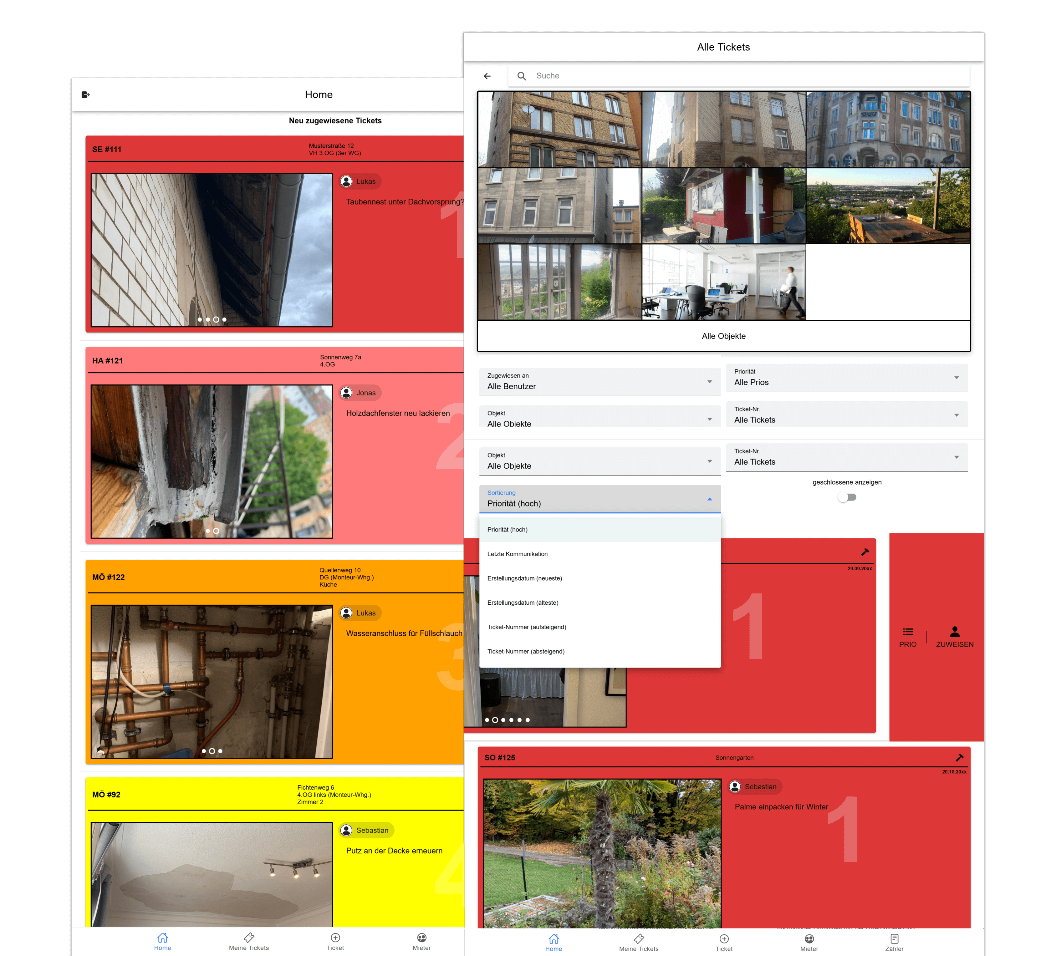 Um die tägliche Arbeit noch effizienter zu gestalten, verfügt das System über umfangreiche Filtermöglichkeiten (nach Objekt, Bearbeiter, Priorität, Status) sowie eine leistungsfähige Volltextsuche nach Bezeichnung oder Ticketnummer. Dies erleichtert die gezielte Steuerung und die schnelle Auffindbarkeit von Tickets erheblich.