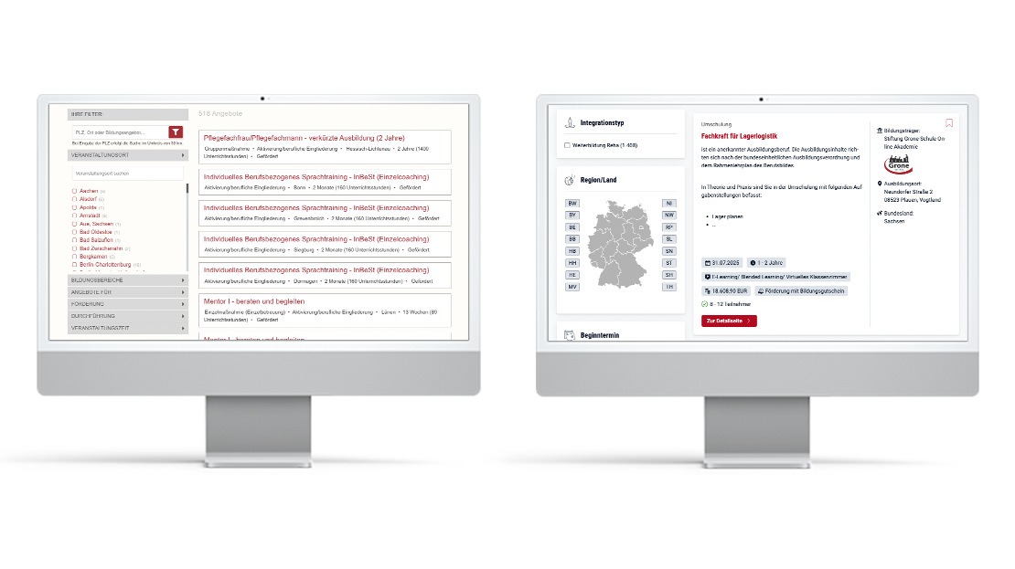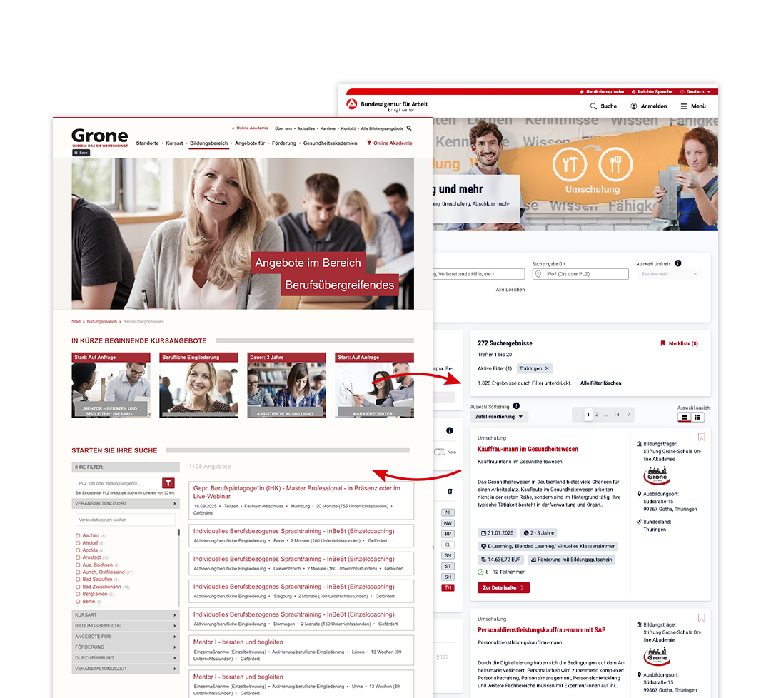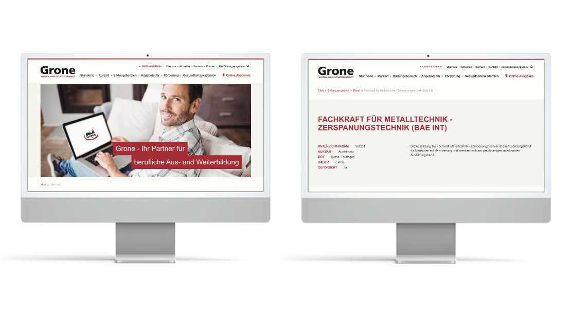Die Herausforderung bestand darin, eine Schnittstelle zwischen der Kursverwaltung der Agentur für Arbeit ("KURSNET") und dem TYPO3-System der Grone Bildungszentren neu aufzubauen und strukturell zu verbessern. Die dezentrale Pflege der Kurse durch die verschiedenen Grone Standorte und Landesgesellschaften über KURSNET musste effizient und zuverlässig in das TYPO3-System importiert werden, um dort weiter angereichert und auf der Webseite dargestellt zu werden. Diese Schnittstellenprogrammierung ist besonders komplex, da regelmäßig Änderungen an Datenstrukturen berücksichtigt werden müssen und eine robuste Qualitätssicherung unerlässlich ist.
