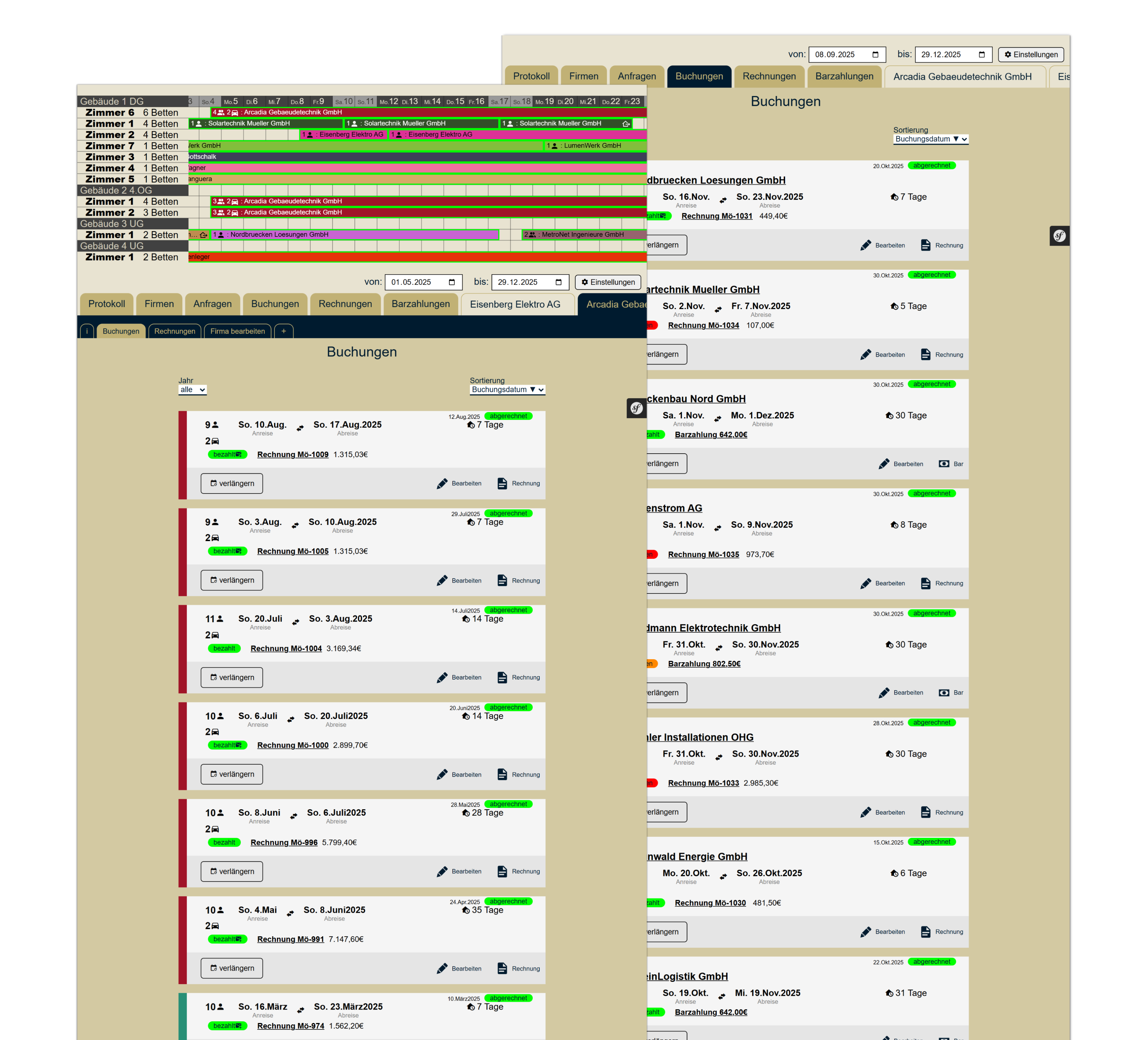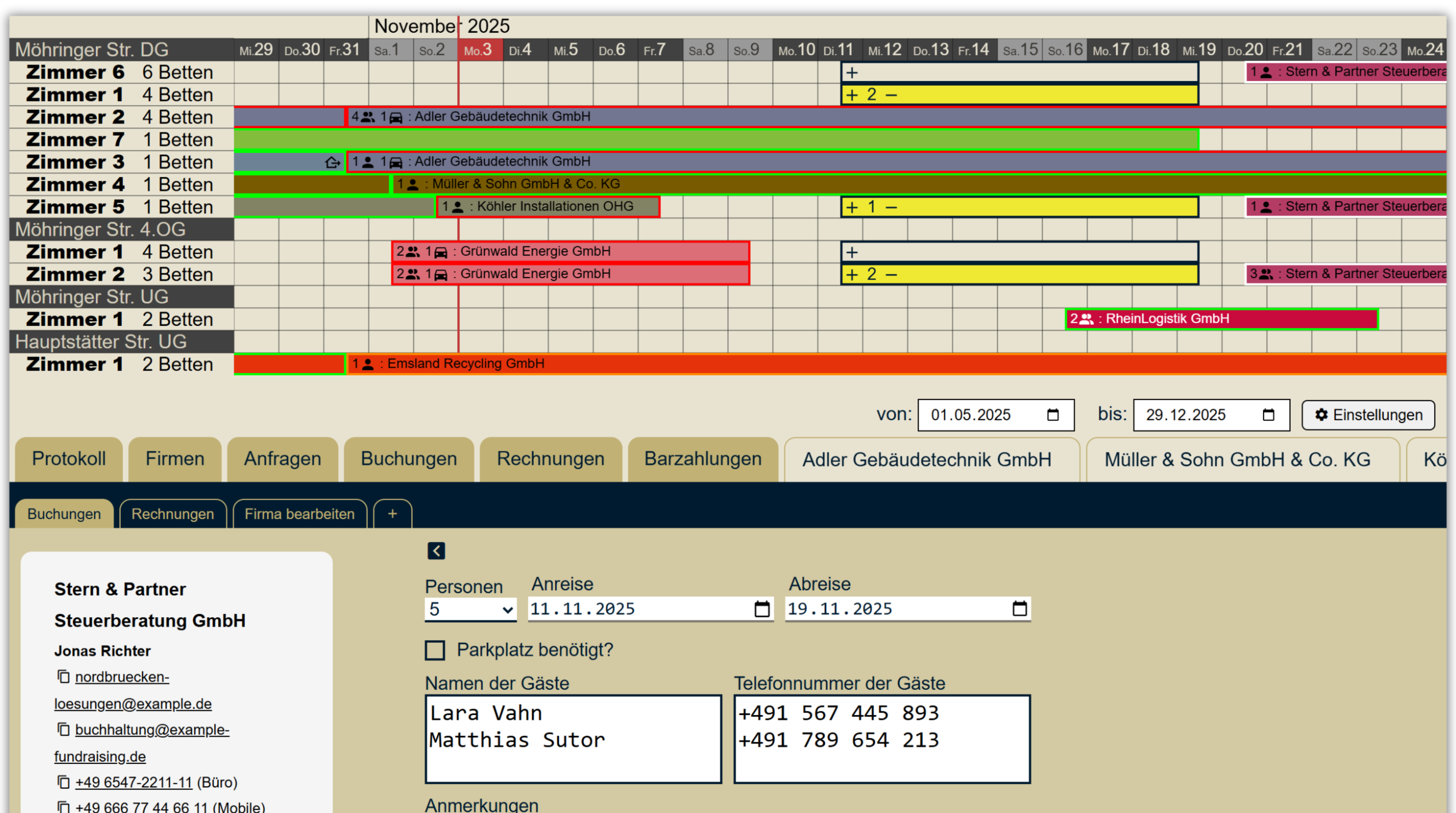 Im unteren Bereich bietet ein Dashboard mit Reitern schnellen Zugriff auf alle zentralen Funktionen: Gäste- und Firmenverwaltung, Anfragen, Buchungen, Rechnungen, Barzahlungen sowie ein detailliertes Protokoll aller Vorgänge. Jede geöffnete Buchung oder Firma wird in einem eigenen Reiter dargestellt, sodass mehrere Prozesse parallel und übersichtlich bearbeitet werden können.
