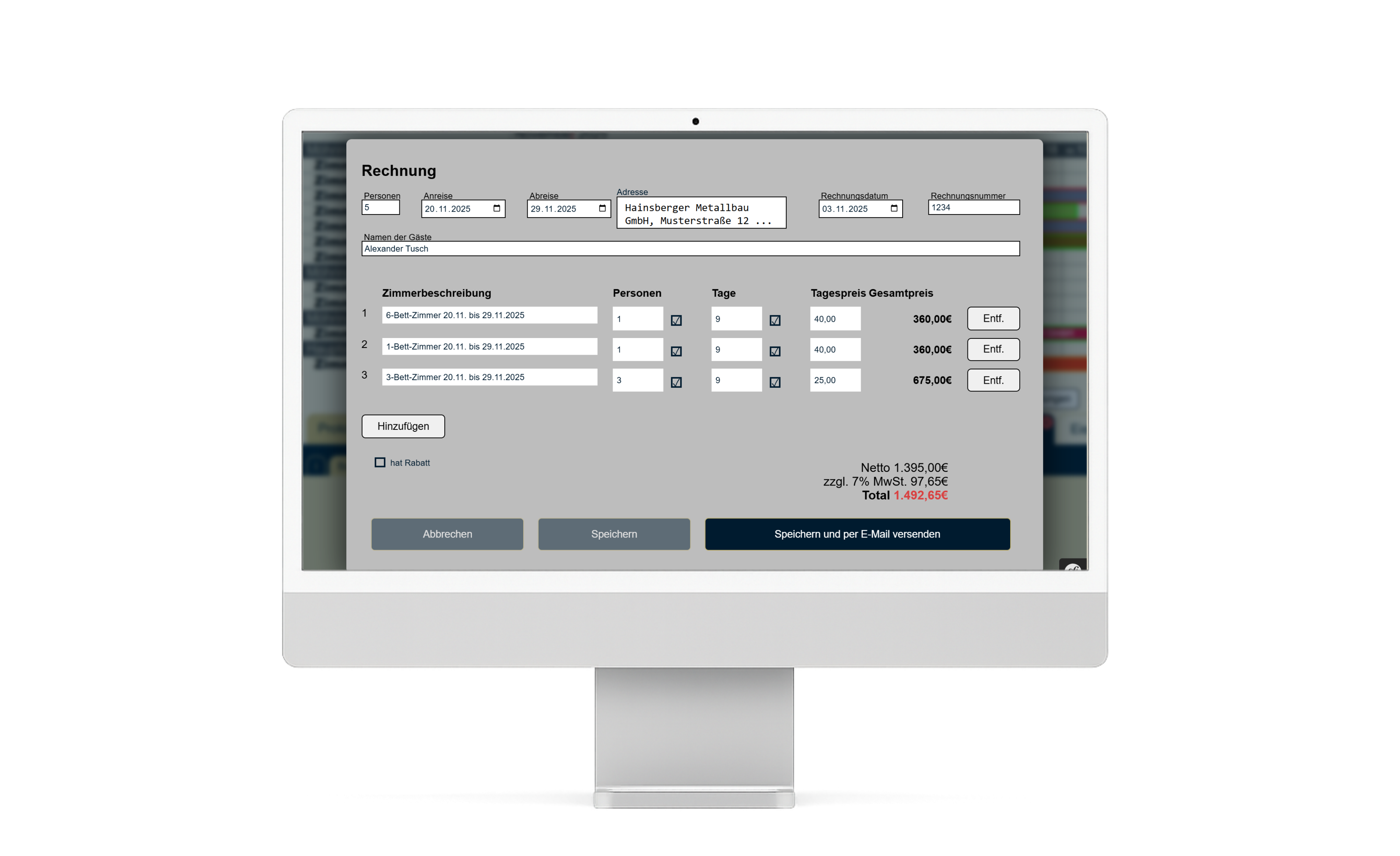 Unsere Kunden suchten deshalb nach einer maßgeschneiderten Branchensoftware, die nicht nur die klassischen Verwaltungsaufgaben wie Buchungen, Rechnungen und Gästeverwaltung abdeckt, sondern diese auch in einer intuitiven, grafischen Oberfläche abbildet. Ziel war eine Lösung, die Abläufe deutlich vereinfacht, Übersicht schafft und die tägliche Arbeit im operativen Geschäft spürbar erleichtert.